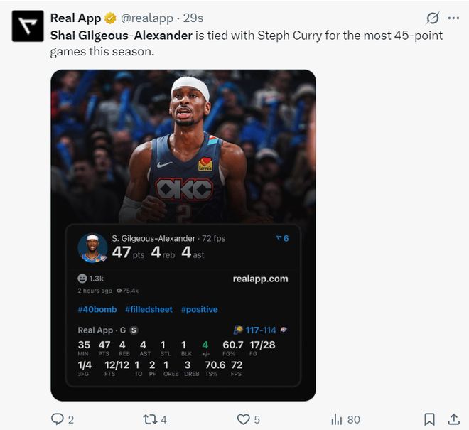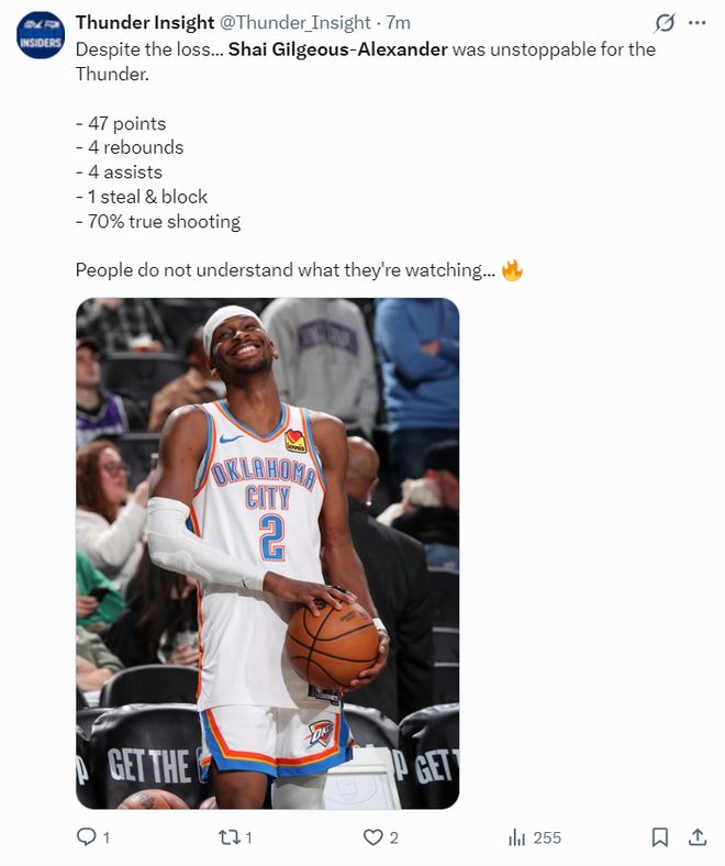 最终步行者5人上双+三人20+暴打雷霆,OKC这边只有两人20+,SGA在末节狂砍15分,全场比赛35分钟,28中17,三分4中1,罚球12中12拿到47分4篮板4助攻1抢断1盖帽,命中率60.7%,真实命中率70.6%,正负值+4。