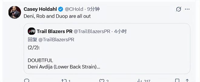 北京时间1月24日,开拓者对阵猛龙,赛前,开拓者官方更新伤病报告,阿夫迪亚、里斯和罗威都将缺席本场比赛。早先,阿夫迪亚被列为小概率出战,里斯和罗威被列为出战成疑,如今三人都将不
