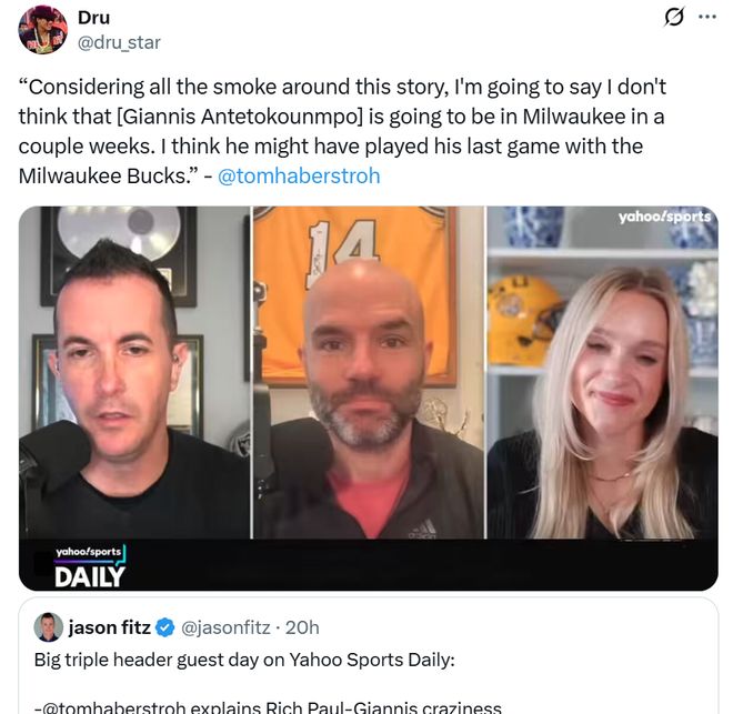 ESPN的Marc J. Spears公开表示,联盟内部普遍认为字母哥已经打完了自己在雄鹿队的最后一场比赛,Tom Haberstroh给出相同说法。