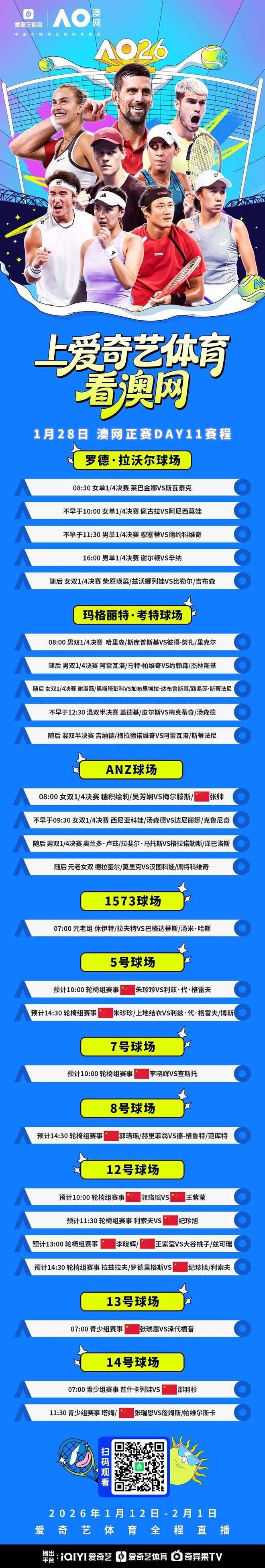- 北京时间1月28日,2026年澳大利亚网球公开赛将进入第11比赛日的角逐,男女单打下半区的1/4决赛将陆续上演,四强名...发表于: 01-29 16:13