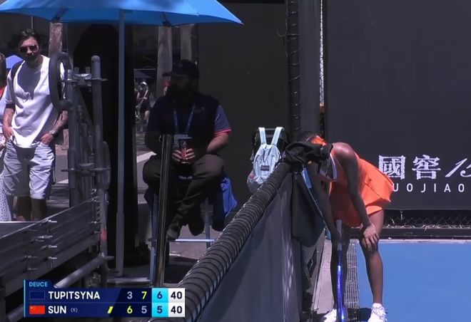 孙心然有些身体不适,多次弯腰休息。第二盘的第九局比赛。孙心然先得1分,但是图皮岑娜随后连续得分保发成功,5比4反超孙心然。