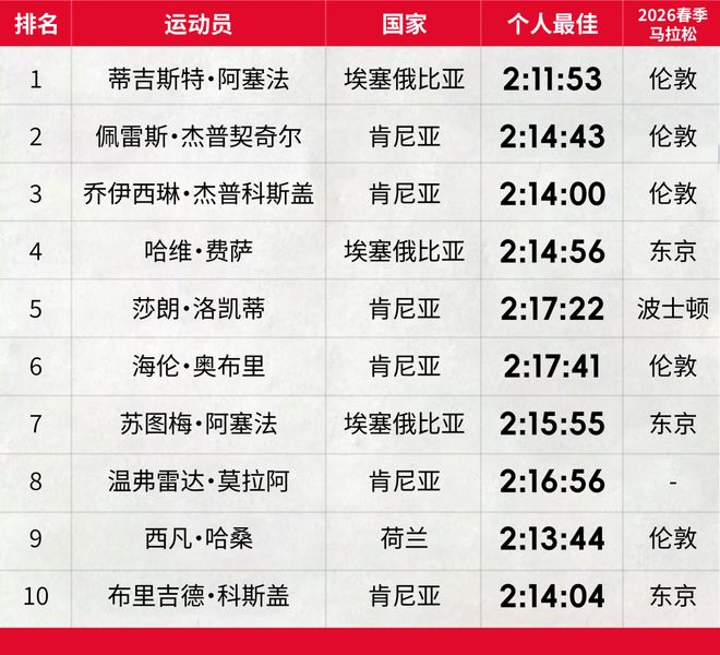总的来说,2026年伦敦马拉松的阵容包括了2025年八大雅培世界马拉松大满贯赛事中四站的卫冕冠军——伦敦(阿塞法)、悉尼(哈桑)、世锦赛(杰普契奇尔)和纽约(奥布里),以及瓦伦西亚冠军(杰普科斯盖)。