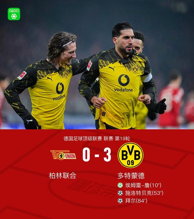 剑南春多特30客胜柏林联合,埃姆雷詹、施洛特贝克、拜尔建功