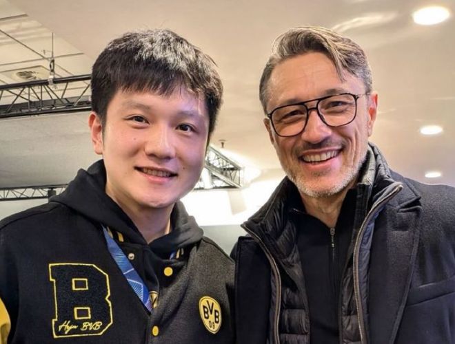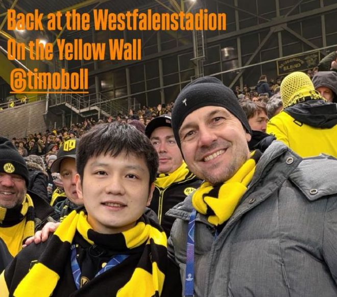 樊振东与波尔再看足球比赛,与多特蒙德主帅合影,喜笑颜开超开心