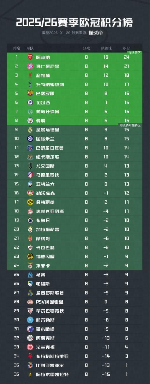 - 北京时间1月29日,2025/2026赛季欧冠联赛阶段最后一轮的比赛已经全部结束!第七轮结束时,已经确定提前出线的阿森...发表于: 01-29 08:53