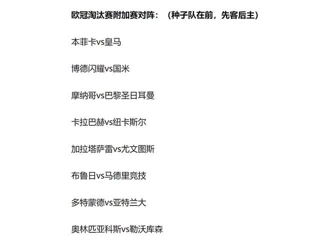 接下来的,淘汰赛附加赛比赛,时间为2月17日、18日,以及2月24日和2月25日。刚好是中国的农历春节期间,球迷可以在假期时间里享受欧冠比赛了。