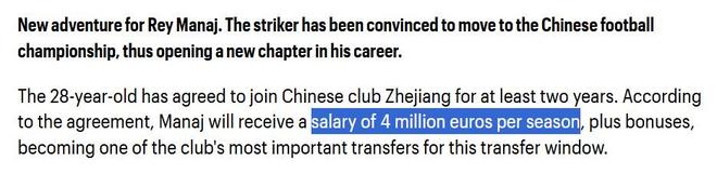 昨日,多家阿尔巴尼亚媒体曝出,阿尔巴尼亚国脚马纳伊同意加盟浙江队,他将与球队签约两年。有消息称他的年薪可达400万欧,并包含有奖金。