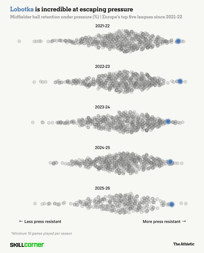 多年来,这位身材矮小的斯洛伐克中场一直是欧洲最擅长抗压控球的球员之一。当The Athletic向他展示SkillCorner数据,证明他在高压下的控球能力时,洛博特卡腼腆地表示:“我真的很惊讶自己能这么出色。”