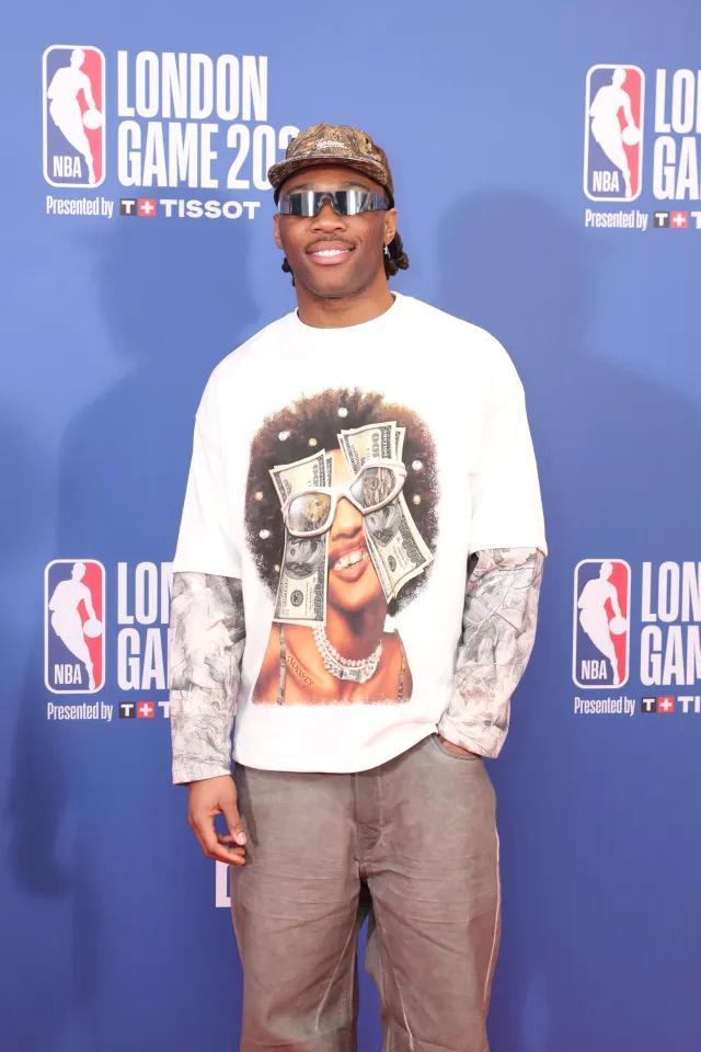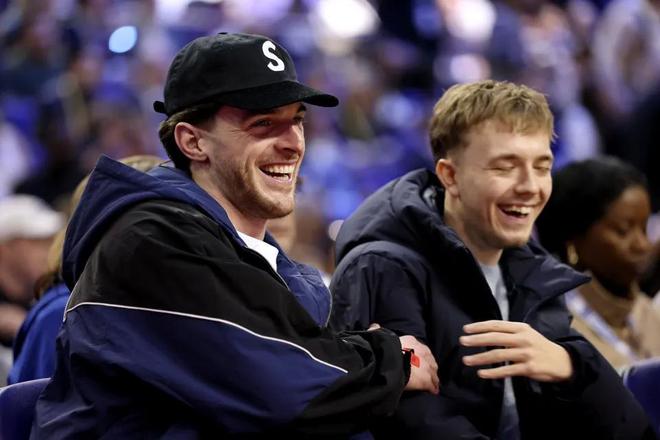 NBA伦敦赛当日下午在伦敦O2体育馆举行,奥兰多魔术对阵孟菲斯灰熊。刚在周六代表阿森纳出战的德克兰-赖斯来到现场观赛,坐在场边贵宾席,视角极佳。