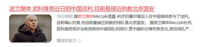 该媒体同时透露,46岁的武科维奇近期结束了在中国数日的考察行程,他与北京国安进行了深入谈判,双方都互相认可的同时,已经就合同细节达成共识,目前仅剩最终的签字环节,另外,据波兰媒体Meczyki补充,武科维奇或许会收到其他中超球队的报价。