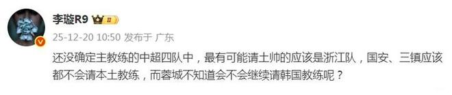 浙江队也是一支奇葩的球队,送走合作多年的乔迪,请来卡内达干了一年,分手。要请土帅了。12月20日,媒体人李璇微博透露:“还没确定主教练的中超四队中,最有可能请土帅的应该是浙江队,北京国安、武汉三镇应该都不会请本土教练,而成都蓉城不知道会不会继续请韩国教练呢?”
