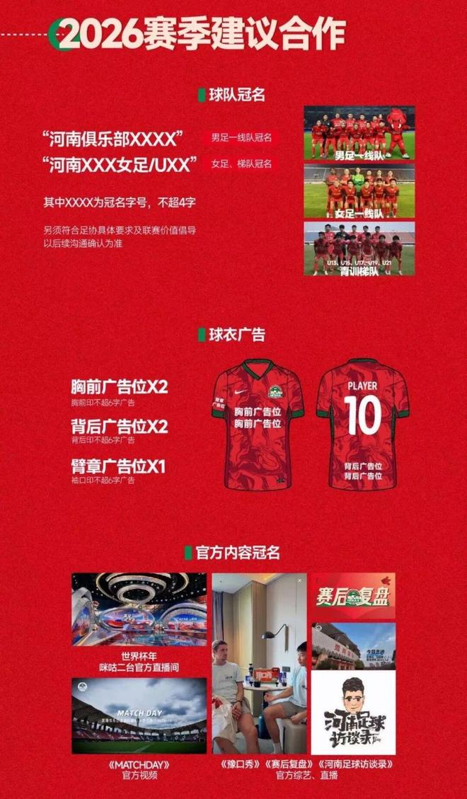 河南足球俱乐部最新发布的官方招商合作公告,2026赛季建议合作中,球衣冠名和球衣广告(胸前广告位x2 背后广告位x1)位列前两位,官宣了河南队仍在投资困境中艰难跋涉,让这支上赛季足协杯亚军球队的前景蒙上阴影。