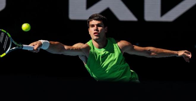 当地时间1月30日,在墨尔本进行的2026年澳大利亚网球公开赛男单半决赛中,西班牙选手阿尔卡拉斯3比2战胜德国选手兹维列夫,晋级决赛。 新华社记者 马平 摄