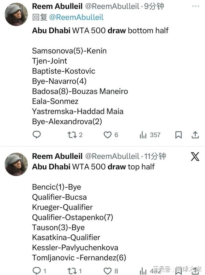 - 1月31日,WTA500阿布扎比站女单签表正式公布,然而,备受中国球迷期待的中国一姐郑钦文并未出现在名单中,据透露,这...发表于: 02-02 16:12
