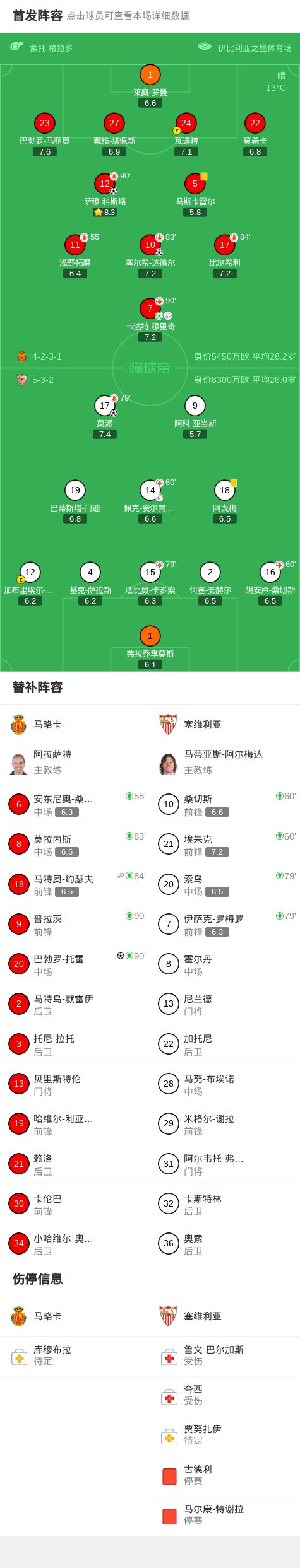 马略卡41大胜塞维利亚,巴勃罗托雷破门,塞尔希达德尔建功