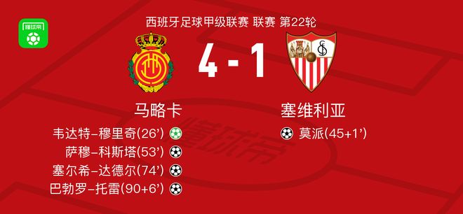 北京时间2月3日西班牙足球甲级联赛 联赛 第22轮,马略卡主场对阵塞维利亚。马略卡韦达特-穆里奇破门,萨穆-科斯塔破门,塞尔希-达德尔破门,巴勃罗-托雷破门。塞维利亚莫派破门。最