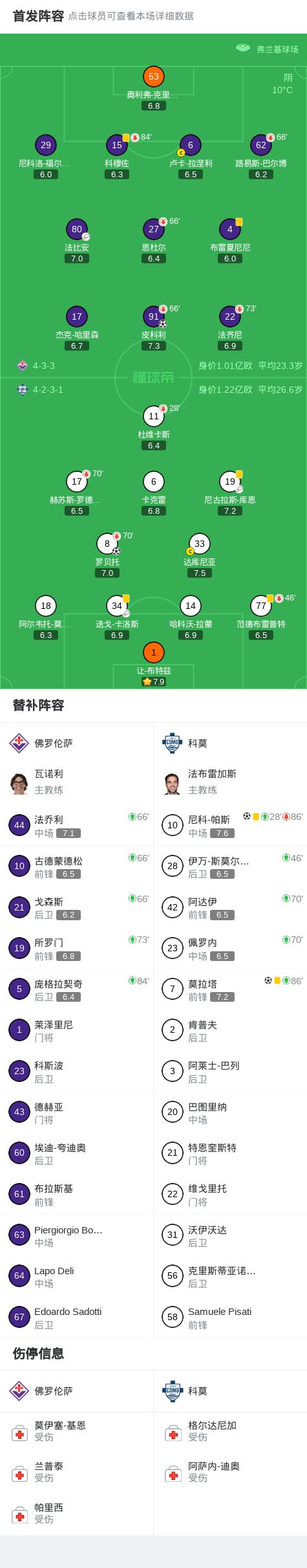 第7分钟,法比安传中,皮科利不停球直接射门得分,佛罗伦萨1-0科莫