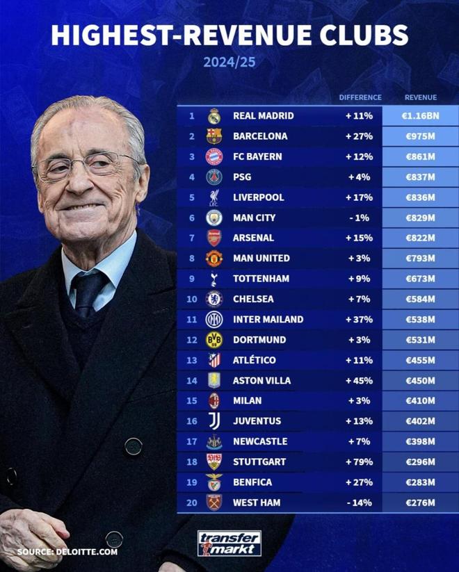 最近德国转会市场引用德勤的数据,发布了“2024/25赛季收入最高的俱乐部”排名:皇马以11.6亿欧元排第1,巴萨9.75亿欧元排第2,拜仁8.61亿欧元排第3,巴黎8.37亿欧元排第4;紧随其后的