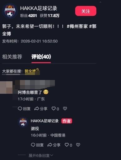 - 据博主“HAKKA足球记录”的消息,梅州客家28岁门将郭全博退役。博主在社媒中写道:郭子,未来希望一切顺利!!!有球迷...发表于: 02-03 07:42